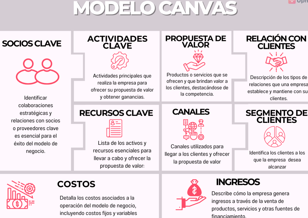 El Modelo Canvas es una herramienta gráfica que permite analizar y diseñar modelos de negocio de manera estructurada. Fue desarrollado por Alexander Osterwalder y representa las diferentes áreas clave de un modelo de negocio en una sola página. El Modelo Canvas consta de nueve bloques principales: segmento de clientes, propuestas de valor, canales, relaciones con los clientes, fuentes de ingresos, recursos clave, actividades clave, socios clave y estructura de costos.